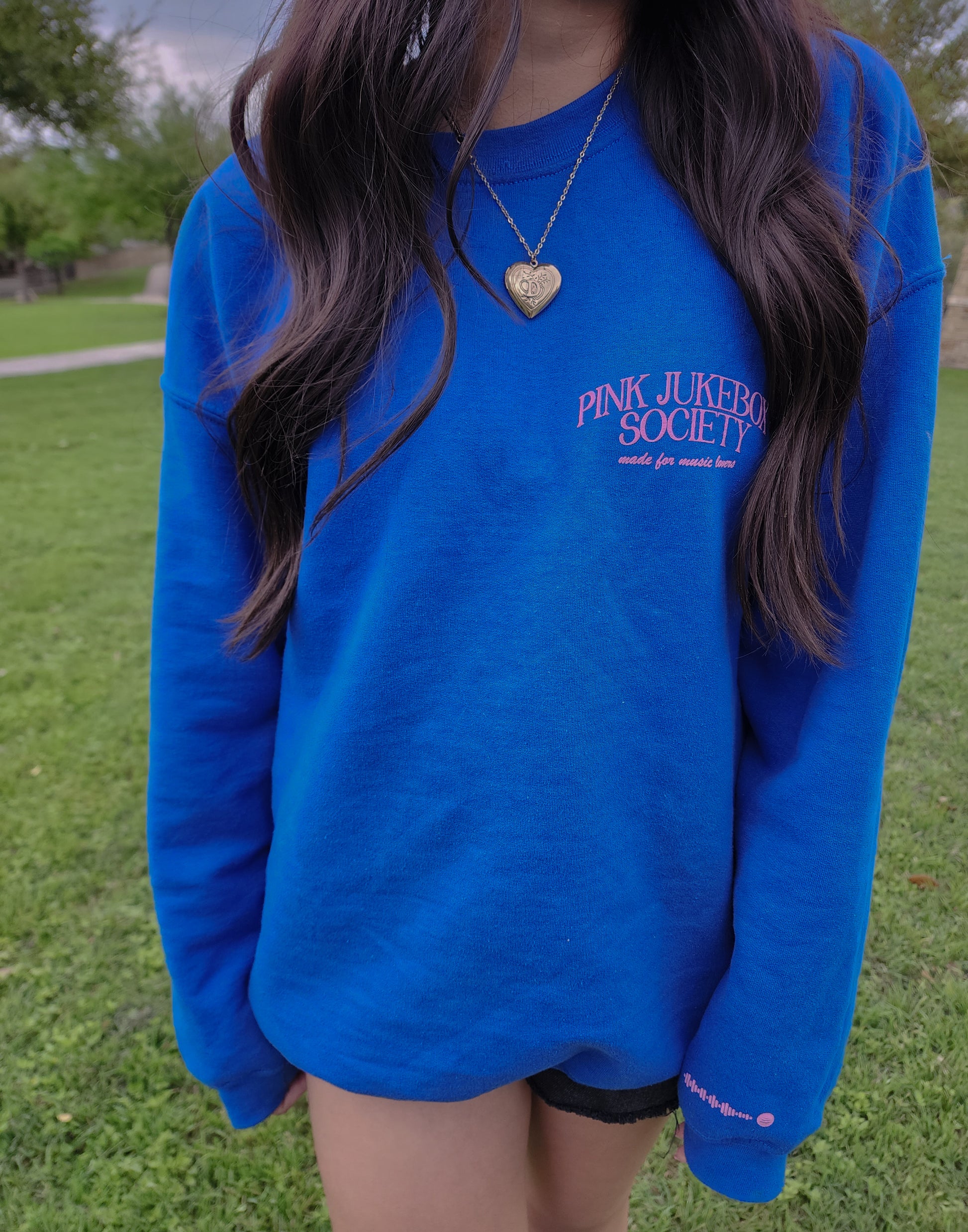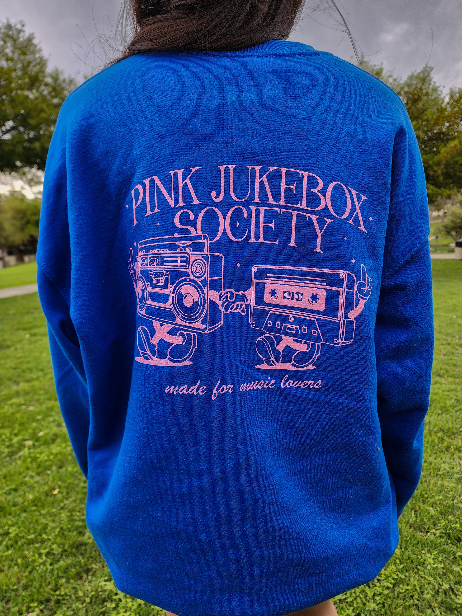 Introducing the Pink Jukebox Society "Made for Music Lovers" Blue Crew. Made with 50% cotton and polyester, this crew is perfect for music enthusiasts who want comfort and style. Fits true to size. We recommend sizing up if you want an oversized look.